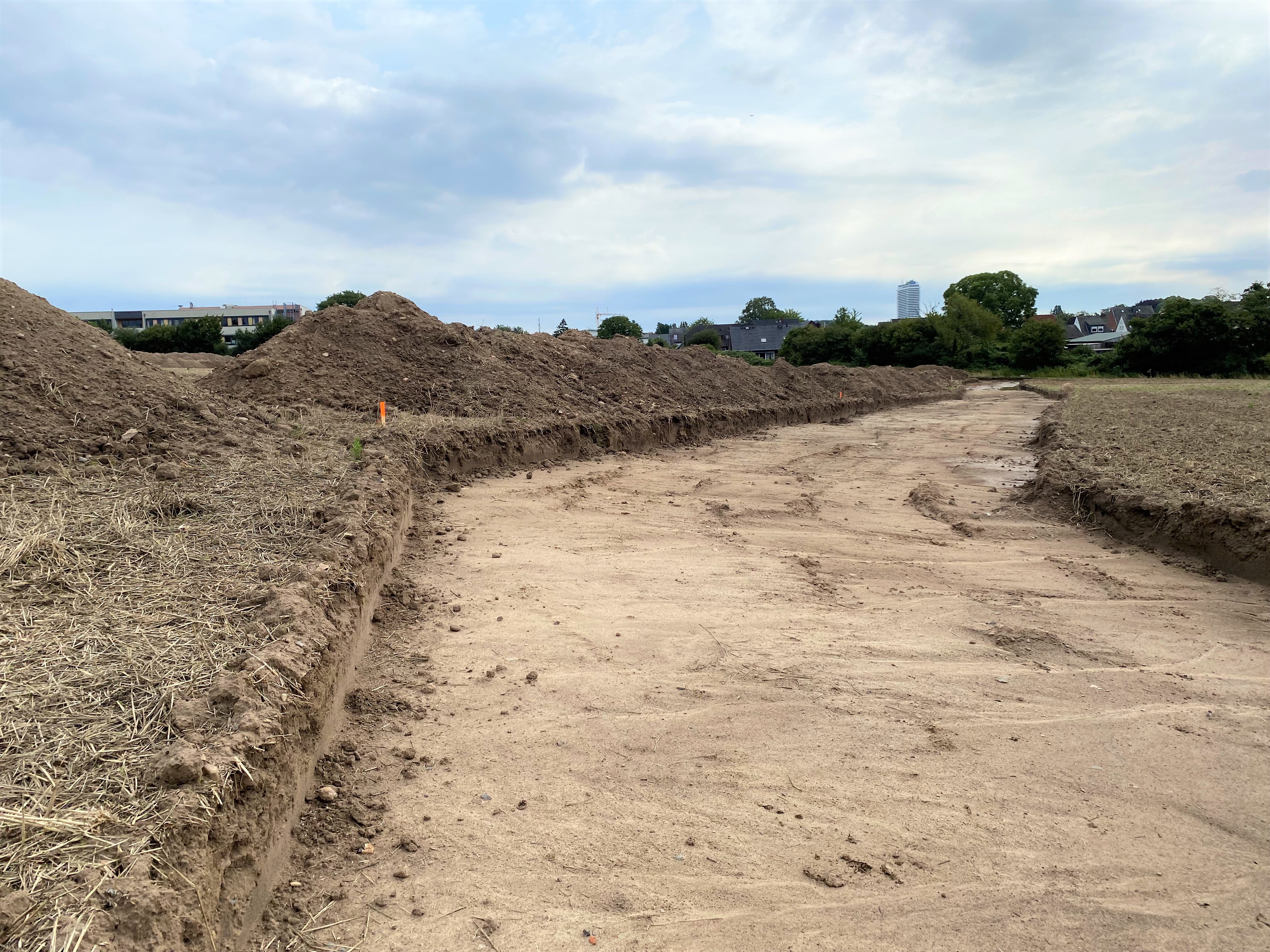 Im Juli wurde mit den vorbereitenden Maßnahmen losgelegt. Die ersten Bagger sind angerollt und haben damit begonnen, die Baustraße zu erstellen. Sie führt von der Straße Am Dreilingsberg direkt in das Areal und verzweigt sich dort. Über diese Zufahrt werden die Fahrzeuge für alle weiteren geplanten Maßnahmen Zugang zum Quartier erhalten.